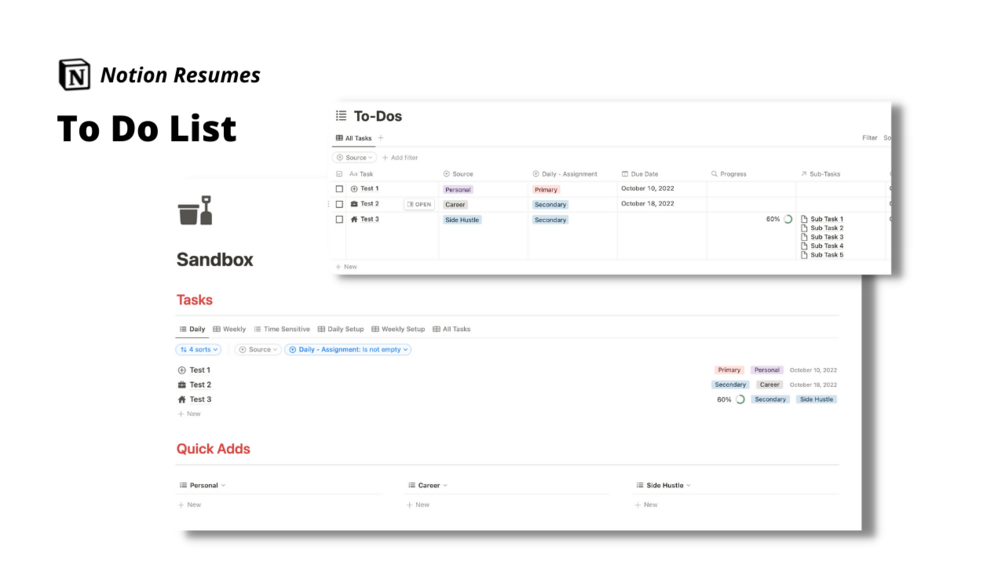- I've cycled through different forms of to do lists for the past 3 years. I've used different mediums, different apps, and a whole lot of paper. To Do lists to me need to be in my face, always accessible, and easy. Notion gave me the tools to do that